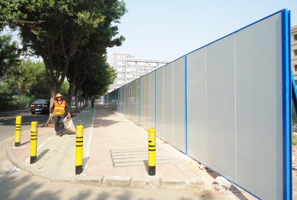 施工圍擋用白色彩鋼板作墻體,用藍(lán)色雙拼C型鋼作立柱,立柱頂部配藍(lán)色造型端蓋(可裝路燈),圍墻四周用藍(lán)色彩鋼框邊。高矮、大小、色澤一致。臟污后隨時(shí)可用水清洗擦拭。